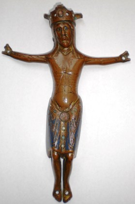 Na peça da coleção, em cobre com vestígios de douramento e aplicação de esmaltes em champlevé, Cristo é figurado com o rosto ovalado e os olhos muito abertos, sendo as pupilas sugeridas por dois pedaços que parecem ser vidro azulado, do qual só restam vestígios. O cabelo com sugestão de ondulados por meio de finos incisos, é comprido, caindo sobre os ombros, a barba e o bigode longos, emolduram o rosto, afilado na zona do queixo denunciando a estética românica. Na cabeça, ereta, Cristo ostenta uma coroa real (não de espinhos), a coroa é decorada por um filete inciso e por pequenas folhas estilizadas que rodeiam seis orifícios onde as gemas foram substituídas por pedaços de esmalte azul-turquesa e brancos denunciando um processo mais económico. Os braços estão estendidos perpendicularmente ao corpo, sendo incisos com alguns traços que sugerem os músculos e as mãos, que estariam abertas, estão danificadas, tendo-se quebrado na zona perfurada para inserção dos pregos, pelo que os dedos são inexistentes (existem dois furos para suspensão da peça, feitos posteriormente).
